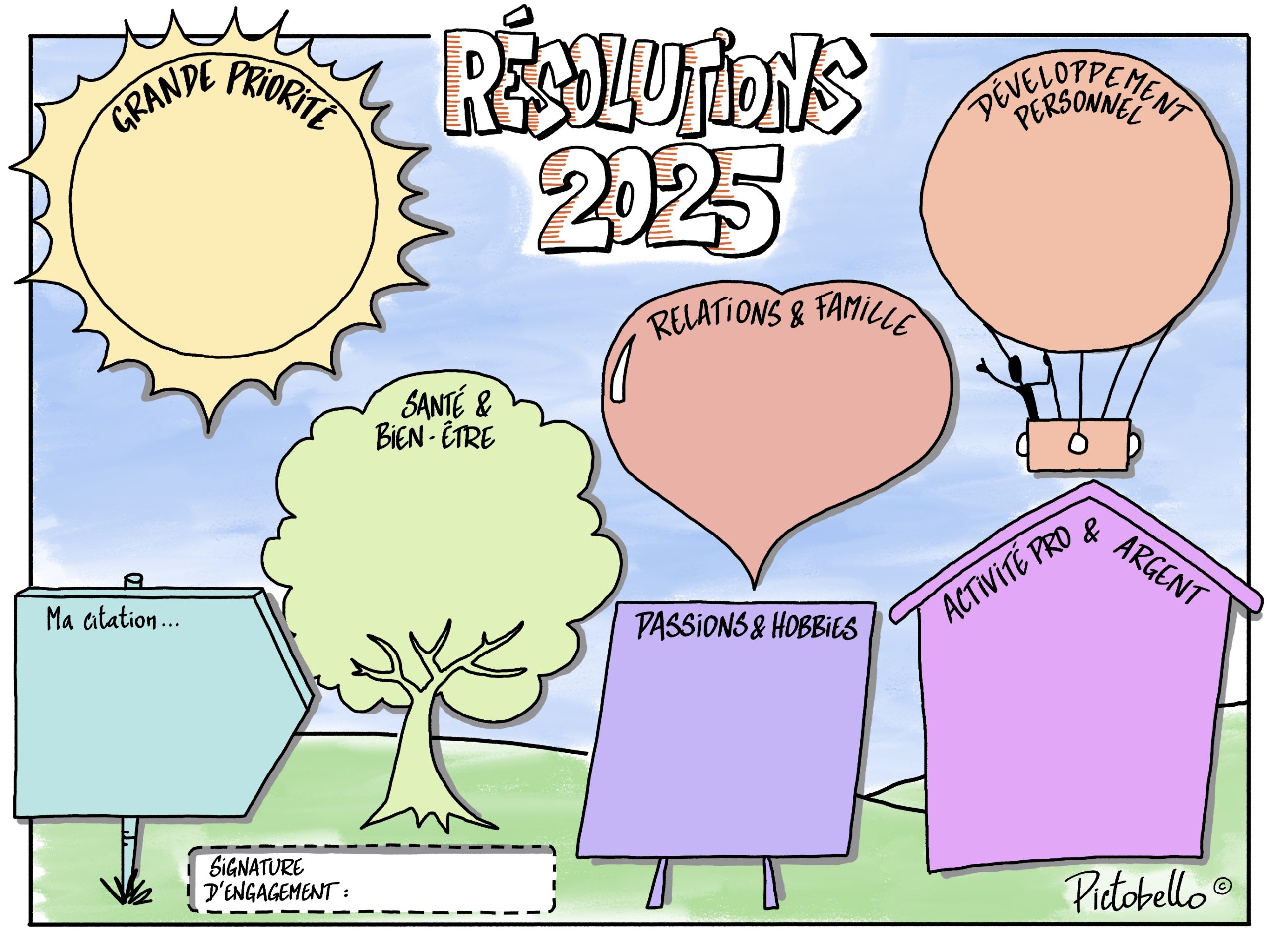 Mais cette fois-ci, pourquoi ne pas transformer vos résolutions en une œuvre visuelle, inspirante et unique grâce à notre sketchnote PICTOBELLO des résolutions 2025 ?