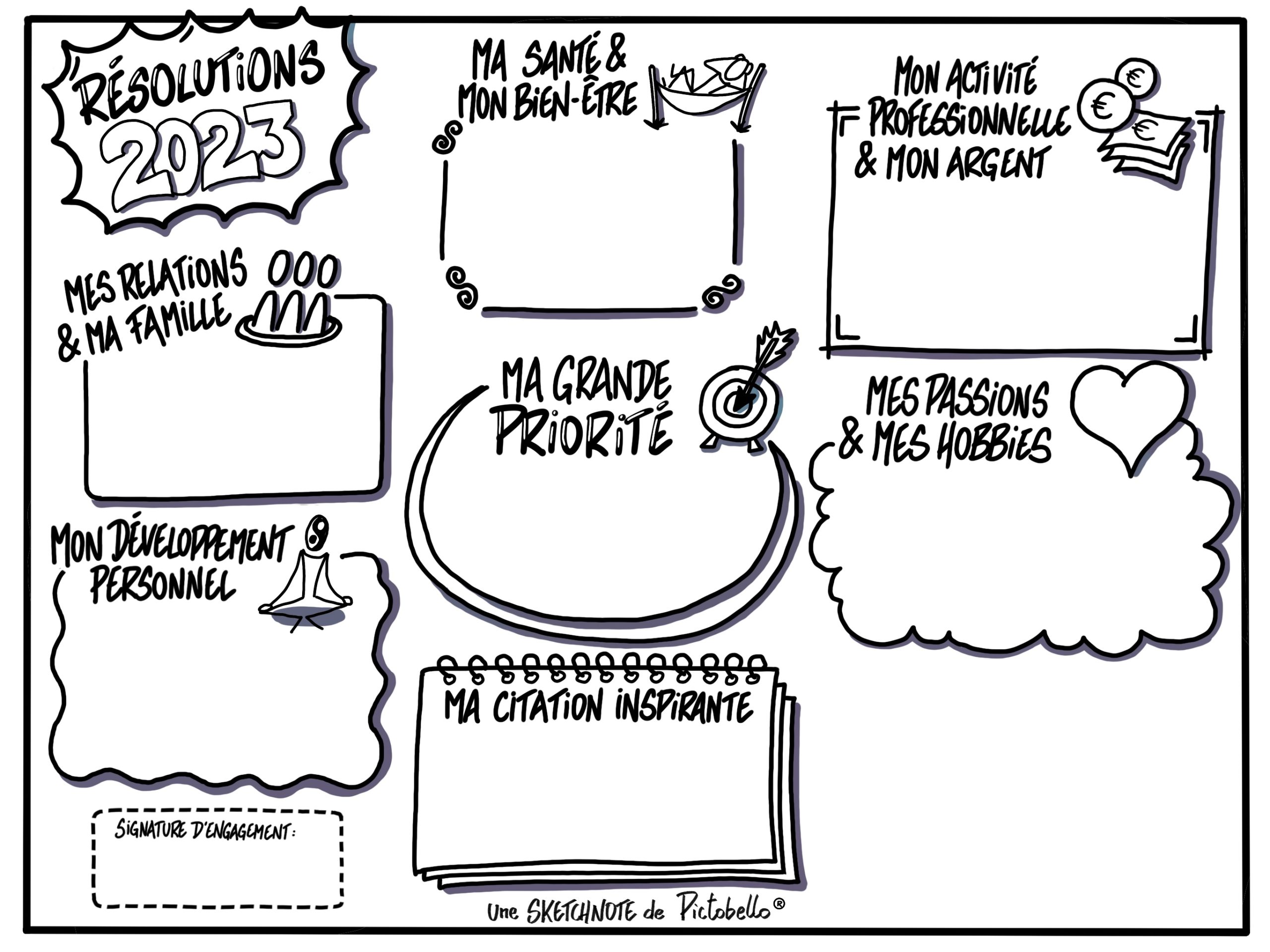 La nouvelle année est souvent l’occasion de se fixer de nouveaux objectifs et de se donner des bonnes résolutions à atteindre au cours de l’année. C’est une manière efficace de se recentrer sur ce qui compte vraiment pour nous et de mettre en place des changements positifs dans notre vie. Prenez un moment et remplissez cette sketchnote offerte par Pictobello. Faites le points sur les domaines importants de votre vie, de manière visuelle, évidemment !